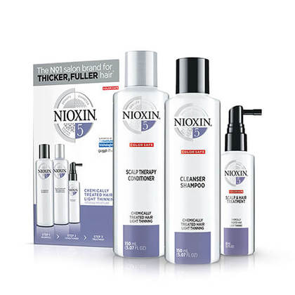 System 5 Kit Includes: Shampoo 10.1 oz, Scalp Therapy Conditioner 10.1 oz and Scalp & Hair Treatment 3.38 oz. Achieve fuller-looking and moisturized hair with the innovative Nioxin 3-part System 5 for Chemically Treated Hair with Light Thinning. This 3-part professional hair thickening treatment with Smooth Plex technology volumizes and delivers smoothing control to hair while refreshing the scalp. Nioxin’s 3-part System reduces hair loss by strengthening resilience against damage and breakage. Moisturizing 3-part System 5 treatment products for chemically treated hair are specially designed to provide thicker, fuller-looking hair vibrant with color. Nioxin Cleanser Shampoo 5: removes sebum and environmental residues from the scalp and hair. Nioxin Scalp Therapy Conditioner 5: a lightweight conditioner that helps provide hair resilience and control moisture balance. Nioxin Scalp & Hair Treatment 5: refreshes the scalp and provides a healthy shine to your hair.